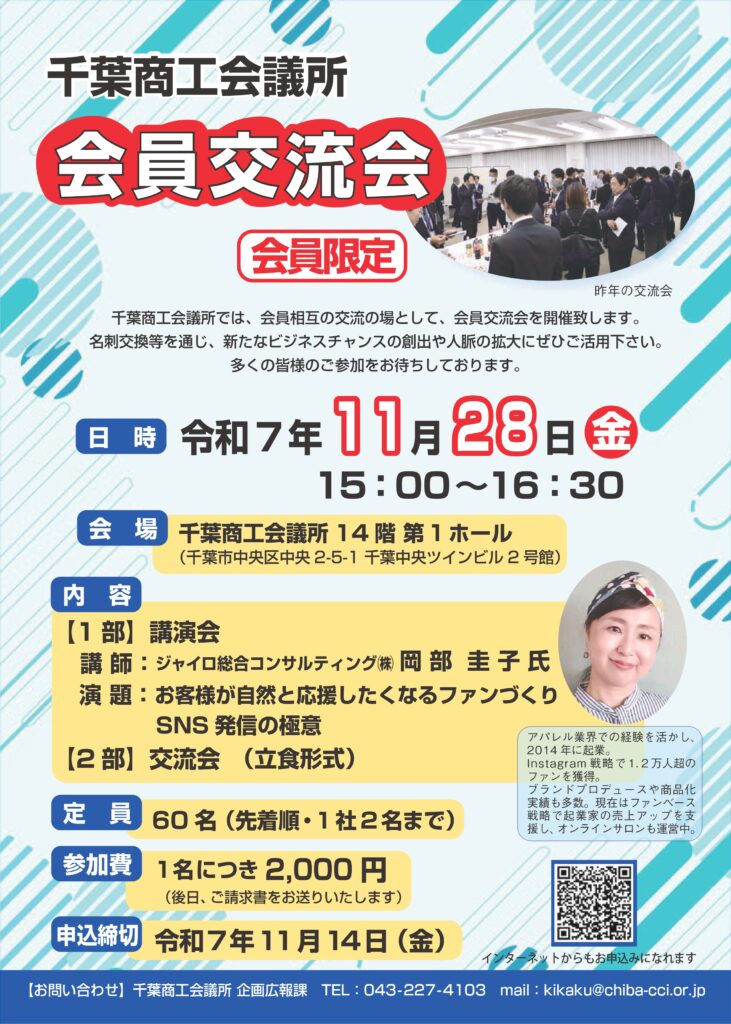 令和6年度、第4回目となる会員交流会を、12月3日(火)15時から千葉商工会議所14階第1ホールにて開催し、41社55名の会員にご参加いただきました。当交流会は2部構成で開催し、第1部ではジャイロ総合コンサルティング 代表取締役 渋谷雄大氏を講師にお招きし「SNSの活用について」ご講演いただいた後、新光重機株式会社 SNSご担当者様により「SNS活用の成功事例」について発表いただきました。参加者は、メモを取りながら傾聴され、大変ご好評いただきました。第2部では、立食形式の交流会を行い、講師のお2人にもご参加いただき、活発な名刺交換や情報交換が行われ、終了時間を延長する程、盛会裏に終了しました。