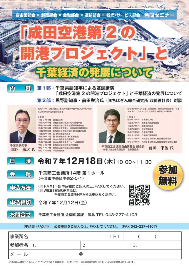 千葉商工会議所自由業部会では「卸売部会」「金融部会」「運輸部会」「観光・サービス部会」のと連携して、下記のとおりオープンセミナーを開催することとなりました。「千葉経済の発展」をテーマに千葉県副知事とちばぎん総研社長による講演と対談を予定しております。ぜひお申込みください。